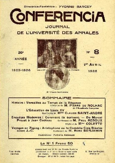 (Conferencia, Journal des Universités des Annales, n° 8, 1er avril 1926)