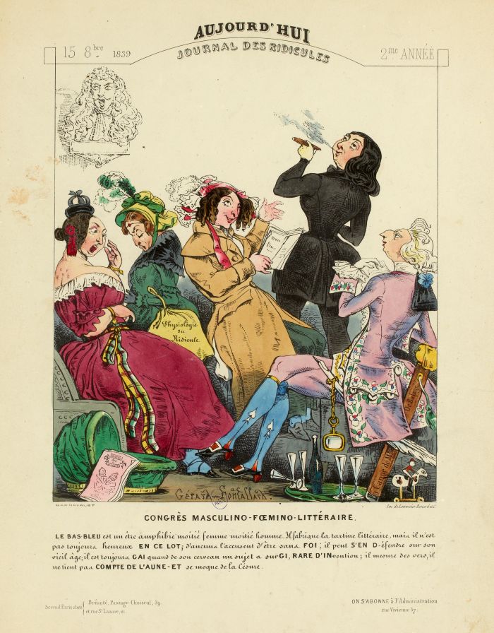 : Pour en savoir encore plus sur cette caricature de George Sand et d'autres intellectuelles, voici un extrait d'un article de Catherine Nesci*, « Épilogue », in George Sand comique (édité par Olivier Bara et François Kerlouégan, UGA Éditions, 2020) : Dans la célèbre lithographie-charge de Gérard-Fontallard, parue le 15 octobre 1839 dans Aujourdhui, journal des Ridicules, George Sand domine un congrès burlesque de femmes de lettres reconnues, dont trois au moins portent des bas bleus. Seule Sand est plus ou moins reconnaissable ; il faut lire la légende pour identifier les autres comparses. À gauche, Virginie Ancelot, pourtant si jolie dans la vie et fort célèbre salonnière, est ridiculisée par sa bouche grande ouverte (signe dennui, détonnement, de scandale ou dhorreur ?) et son petit bonnet en forme de mini-couronne au sommet de la tête, détail évoquant la distinction de son salon qui servait de passage obligé pour lintronisation à lAcadémie française. À côté delle, une Eugénie Foa très vieillie, tout à fait méconnaissable, les yeux fermés, tient une grosse besace jaune qui porte linscription en italiques, bien visible, de Physiologie du ridicule ; son profil anguleux souligne son visage contracté dune manière disgracieuse, sans que lon sache sil y va du dédain, du dégoût, de la colère ou de lamertume chez cette vieille femme dont la besace signale aussi la quête de largent. Au centre, la doyenne de ces dames dans la vie réelle, Sophie Gay (ou bien est-ce sa fille Delphine ?), drôlement chapeautée et vêtue dun long manteau redingote découvrant les détails dun pantalon et les bas bleus, lit avec délice lune de ses productions et incarne lhumour et la gaieté, voire lébriété. Sa fille Delphine de Girardin disparaît complètement sous le travestissement du vicomte de Launay. Le dessin et la légende, qui appellent au décryptage complice dun public misogyne et antisémite, jouent sur les stéréotypes, et sur un double comique de mots et de situation. George Sand, debout, se détache de cette réunion de dentelles et de chapeaux, où les bas-bleus grimaçants sont serrés jusquà la promiscuité. Inversement, regardant vers le haut, comme suivant avec prétention la fumée de son cigare, en costume masculin, elle expose sa chevelure coupée et non coiffée ; toute de noir vêtue, elle porte le pantalon ainsi quune redingote cintrée à la taille. La sobre modernité du costume et la chevelure mâle contrastent avec la tenue masculine, noble et désuète, au ton pastel, du supposé vicomte de Launay, qui est quant à lui perruqué, assis au premier plan à droite, détaché lui aussi du trio et regardant la scène. Le prétendu vicomte est virilisé par la longue et large canne sur laquelle court le titre La Canne de M. [ ] de Balzac (le best-seller de Delphine de Girardin) et qui se termine par un pommeau doré en tête de Balzac (on reconnaît le profil balzacien bien joufflu) sur lequel sappuie le vicomte. Les lettres complétant le substantif de M[onsieur], sur la canne, sont cachées par le pan gauche de la veste et lextrémité barbue de la plume de paon, dont le calame phallique, alourdi dun énorme grelot (symbole de la satire ?), ressort de la veste au niveau des cuisses, tel un sexe en érection ; ces deux substituts de lépée en disent long sur le pouvoir fantasmatique castrant usurpé par le vicomte travesti et portant de longs bas bleus. On notera que la légende explicite lattaque antisémite en ce quelle cible la judéité et la supposée bassesse dEugénie Foa, identifiée par le « manque de foi » (chrétienne) de celle qui regarde vers le bas, notation gestuelle redoublant la charge de limage et le choix des couleurs (les tons jaunes et verts de son costume lassocient au mal, à lambivalence), tandis que George Sand est liée à ce même manque (la phrase continue), mais sur le mode de la défense :